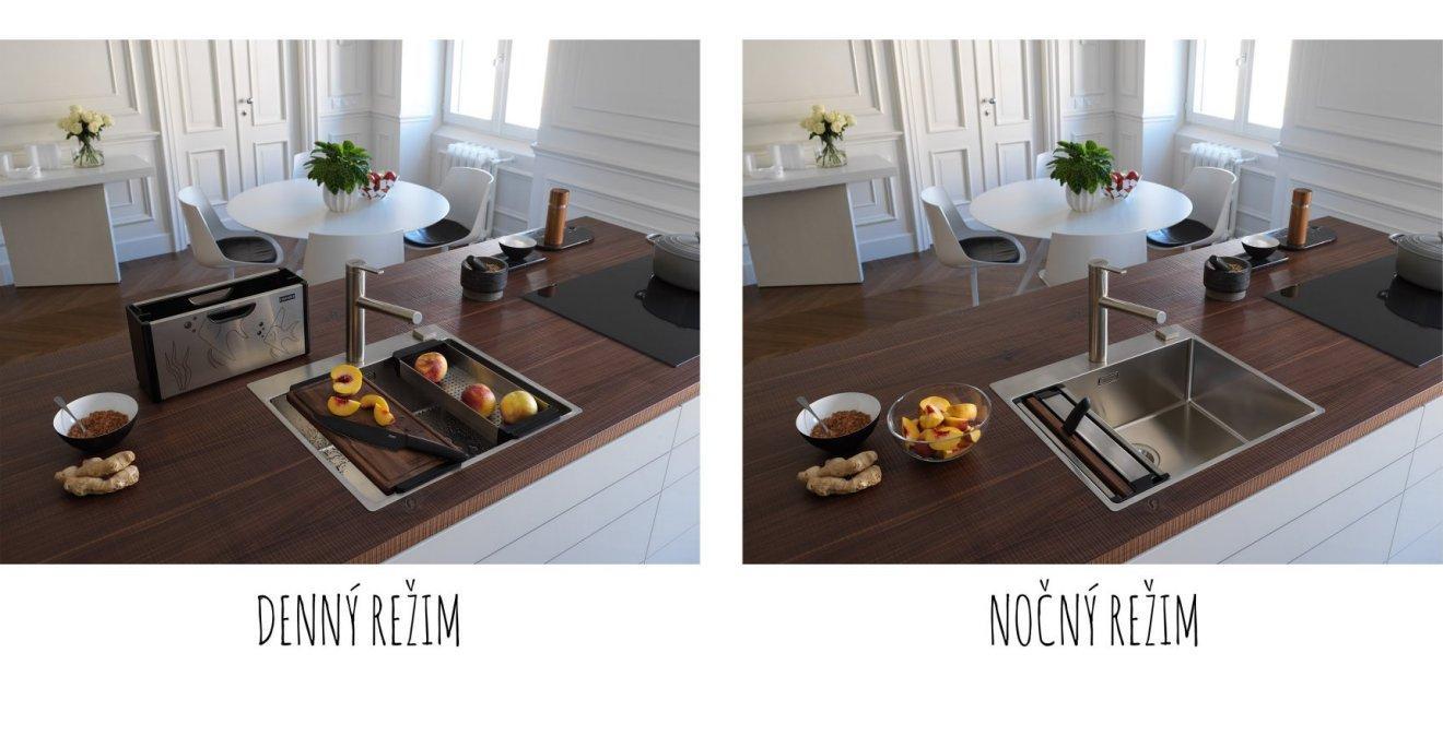 Inovatívna a štýlová sada obsahuje uskladňovací box, nerezovú odkvapkávaciu misku, prípravnú dosku na krájanie z orechového dreva a kuchársky nôž. Všetky tieto základné nástroje pre prípravu jedla zostanú po ruke, keď ich potrebujete (denný režim). Alebo diskrétne schované, keď ich nepotrebujete (nočný režim). Po dokončení sekania, krájania a opláchnutí doplnky umyte a vložte späť do boxu a nechajte ich vyschnúť. Dokonalé, bezpečné uskladnenie a zároveň hygienické sušenie.