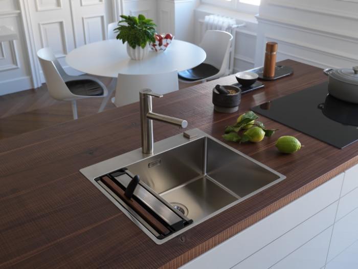 Doplnky, ktoré potrebujete k vareniu, máte na dosah ruky – v elegantnom boxe, dokonale pasujúcom do drezov Box (BXX). Súčasťou boxu je miska, doska a nôž.