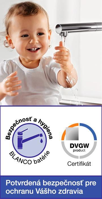Čistá voda zaisťuje zdravie spotrebiteľa. Preto BLANCO necháva svoje batérie dobrovoľne testovať podľa požiadaviek vyhlášky o pitnej vode v spoločnosti DVGW CERT GmbH (zertifikované pracovisko Nemeckého združenia pre plyn a vodu e.V.). Tým BLANCO dosvedčuje, že dodržiava nároky na ochranu pitnej vody. Preto sú BLANCO batérie jednými z najkvalitnejších, aké v súčasnosti trh ponúka.