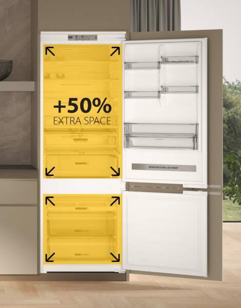 Technológia Total No Frost umožňuje ideálne podmienky na uchovávanie potravín tým, že zabraňuje tvorbe ľadu v mrazničke a tvorbe vlhkých kvapiek na zadnej stene chladničky.