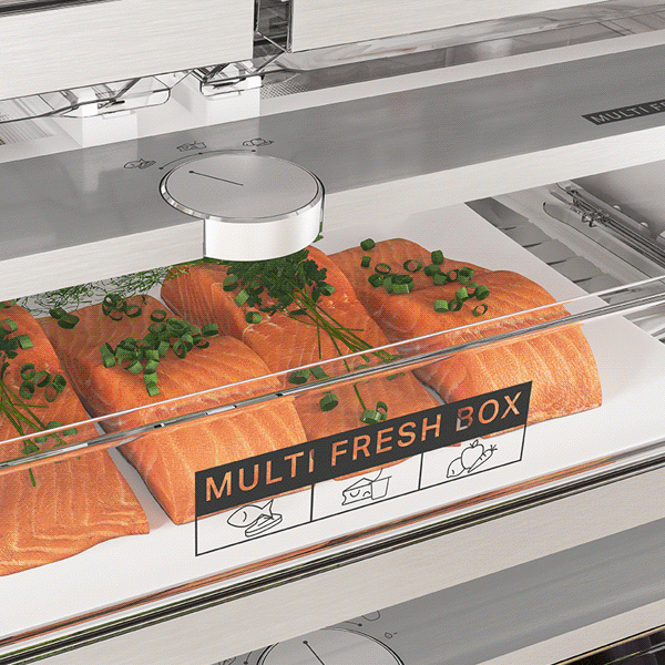 Multi Fresh box je prispôsobiteľná zásuvka s 3 rôznymi nastaveniami teploty na skladovanie potravín so špecifickými potrebami. Stačí otočiť gombíkom a nastaviť teplotu na špeciálne nastavenie a zachovať tak čerstvosť rýb a mäsa, mliečnych výrobkov alebo ovocia a zeleniny.